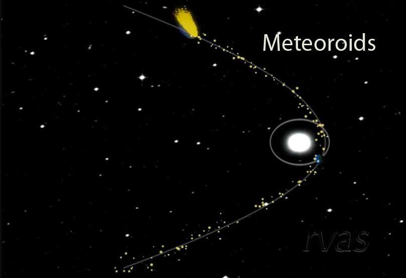 3.4 The Meteoroids: We saw that the solar radiation pressure depends on the size and nature of the grains. It is maximum for grains in the range of 0.2 to 0.4 microns and negligible for grains larger than 100 microns. These large grains continue to move in the comet’s path due to inertia. Thus, even after the comet has left the inner solar system, the associated meteoroids populate its path.