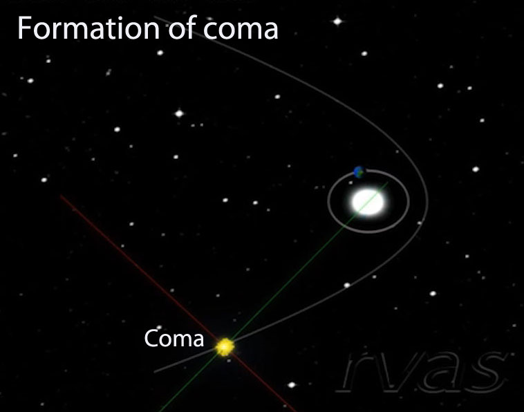3.1 The coma: The cometary nucleus starts warming as it approaches the Sun. At the negligible pressure conditions in space, the ice sublime directly from solid to gaseous state. In the process, tiny dust grains are dragged by the expanding gases, forming an envelope called a coma around the nucleus. The sunlight illuminates the dust grains in the coma.