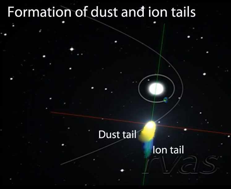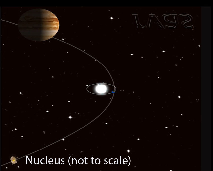 Comets orbit around the Sun in elliptical orbits. Let us observe what happens when a comet approaches the perihelion. As shown in the figure on the lower left, at far distances, the comet is a bare nucleus made of ice and rock. The planet at the top left is Jupiter. Only the Earth’s orbit is shown.